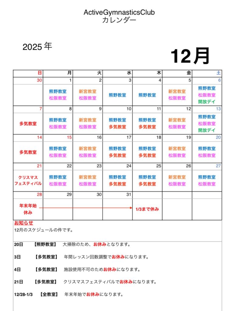 12/28(土)〜1/3(金):年末年始につき全教室お休みとなります。
